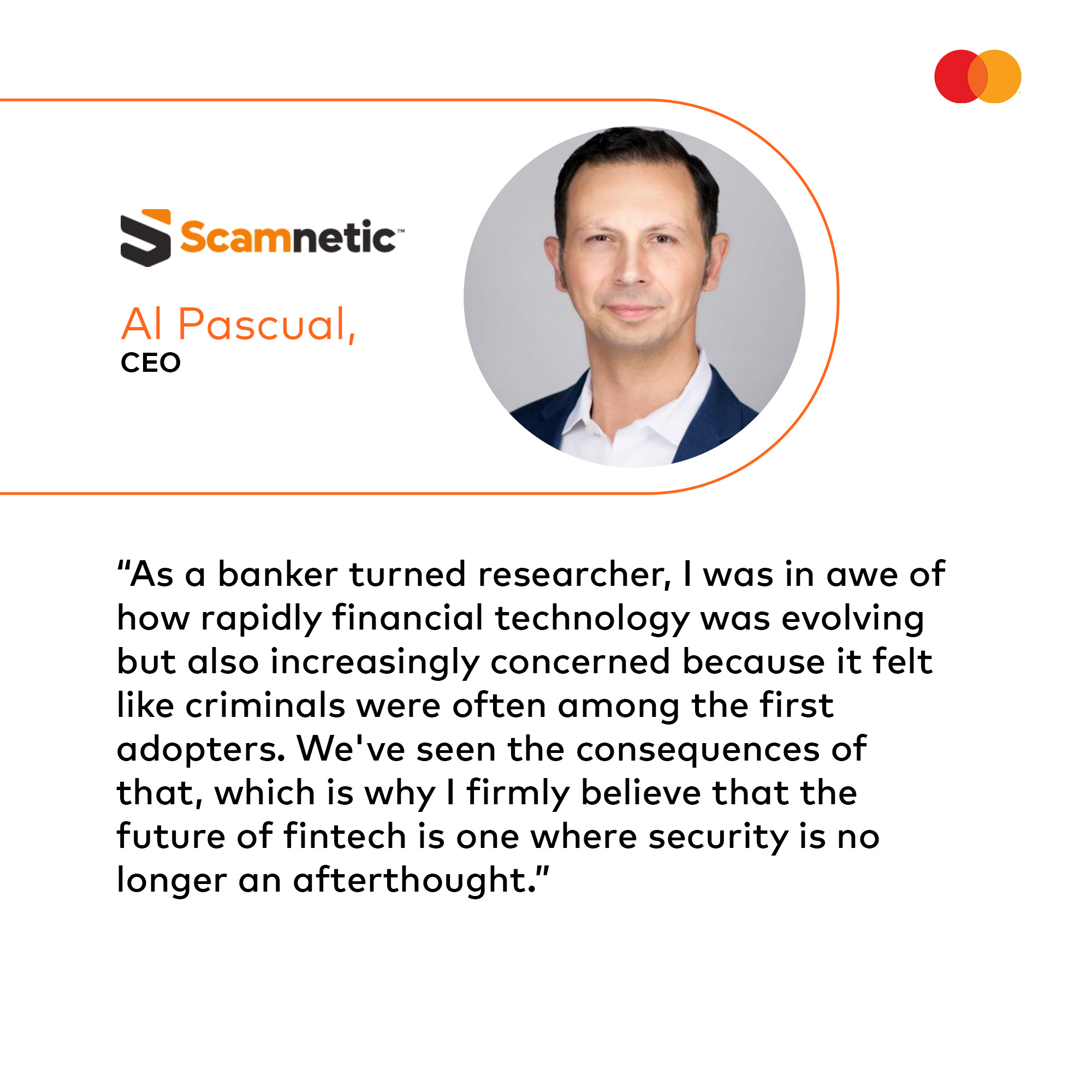The Mastercard Start Path program is an award-winning startup engagement program that is shaping the future of financial technology and security. With a particular focus on fraud prevention, cybersecurity, digital identity, and payment resiliency, the Start Path Security Solutions program connects emerging leaders like Scamnetic with Mastercard’s vast global network of partners, resources, and expertise.