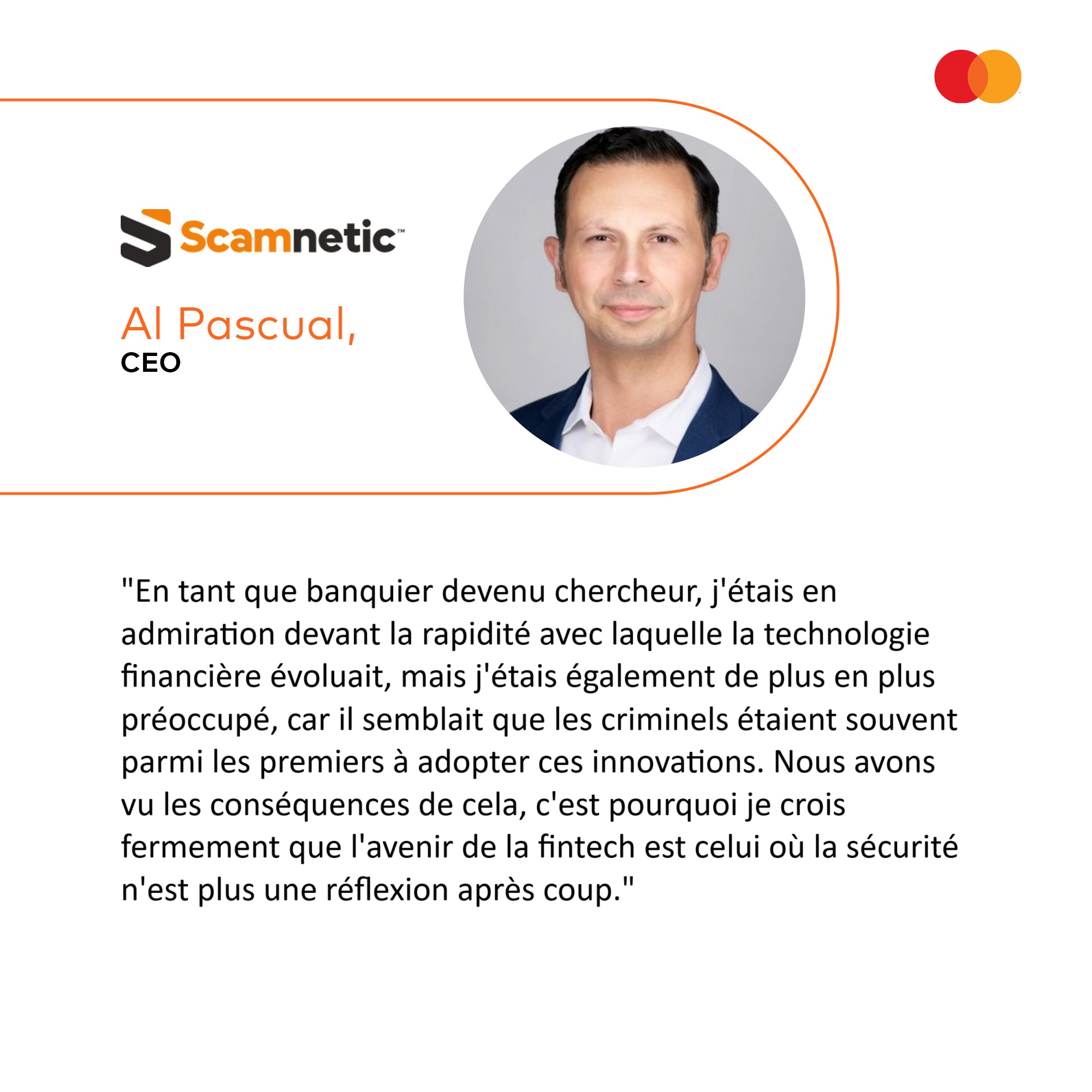Chez Scamnetic, nous considérons que ce problème peut être résolu : il nécessite des outils plus intelligents, une collaboration plus large et un véritable engagement en faveur de l’innovation. La détection proactive des arnaques en temps réel ne devrait pas être une fonction haut de gamme; elle devrait être un enjeu pour toute organisation cherchant à établir une relation de confiance avec ses clients. C’est pourquoi joindre le programme Start Path de Mastercard est si important. Cela nous offre la possibilité de faire évoluer notre technologie plus rapidement, d’apprendre des leaders mondiaux en sécurité financière et, en fin de compte, d’offrir une protection encore plus puissante aux entreprises et aux particuliers qui nous font confiance.